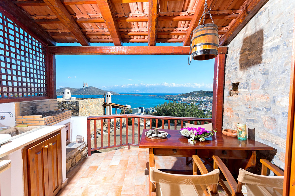 The true soul of Leonidas reveals itself in the upper sea-view bedroom. Here, days begin not with the noise of a bustling town, but with the soft morning light breaking over the waters of Elounda Bay. The interior architecture honors its village roots, combining thick Cretan masonry and traditional woodwork with a simple, comfortable layout that accommodates up to three guests, creating a feeling of absolute warmth and privacy.